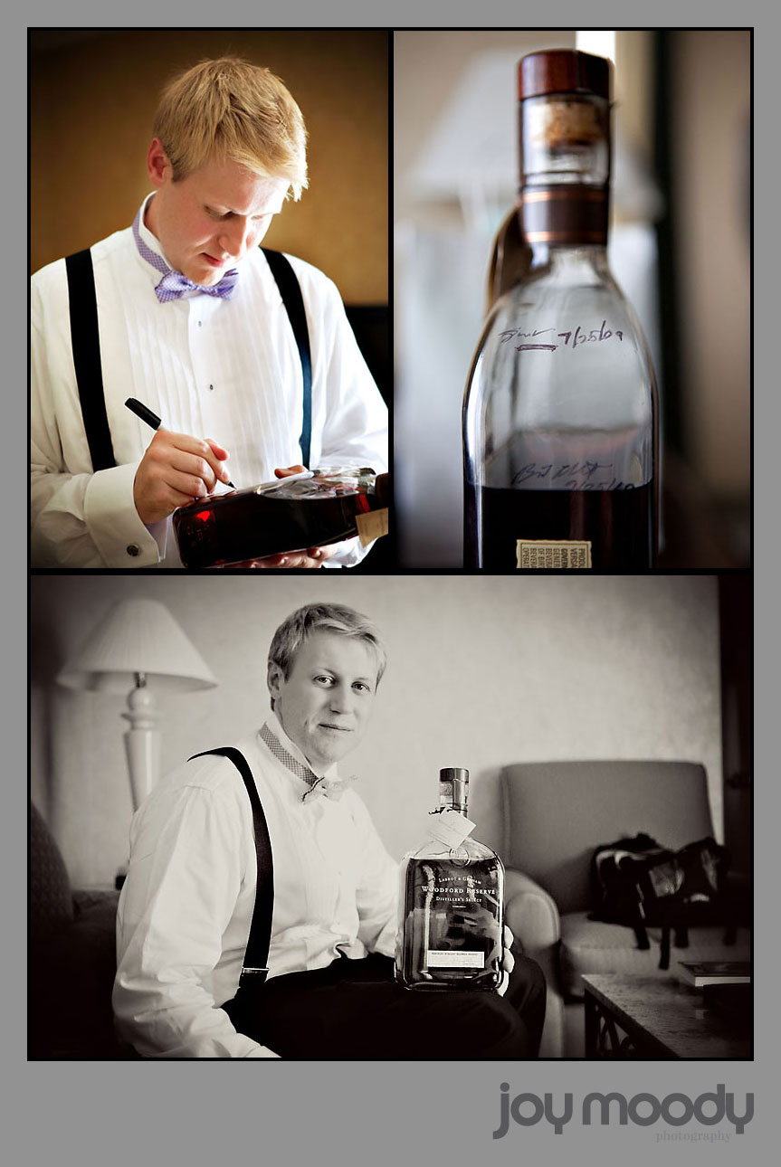 Brent and his buddies have a tradition of toasting with a special bottle of bourbon and signing it on their wedding day.